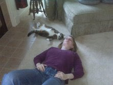 I was doing an Alexander method "lie-down" this afternoon, and my kitty Basil joined me in front of the fireplace...